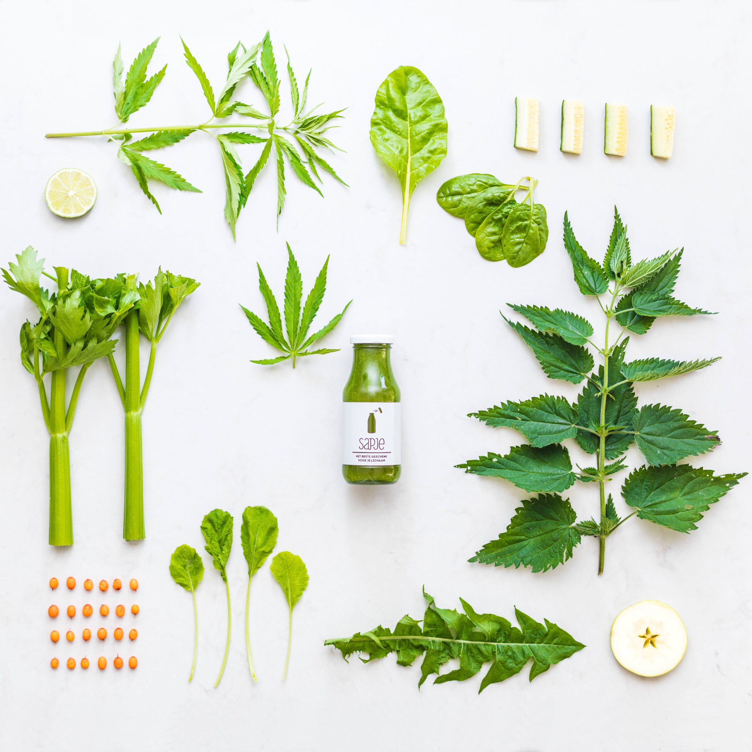 Current ingredients in the Wild Sapje: celery, nettle, spinach, granny smith, cucumber, lime, sea buckthorn berry, turnip stem, dandelion leaf, hemp plant and hemp oil (10% CBD)