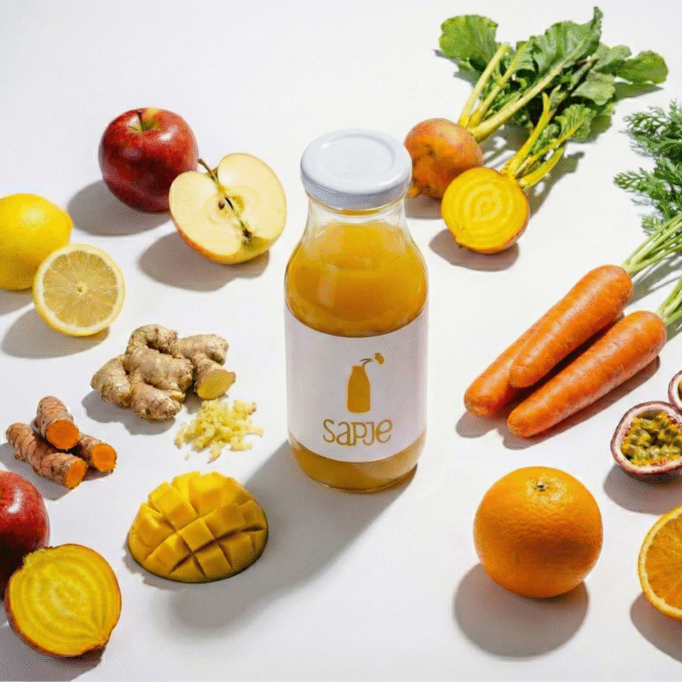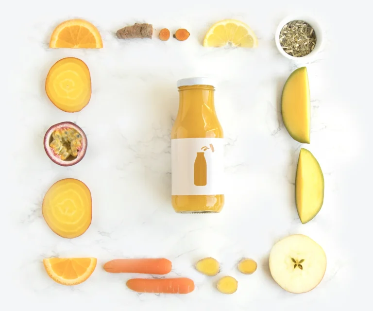 Citroen, Appel, Gele biet, Gember, Kurkuma, Mango, Mate thee, Passievrucht, Sinaasappel, Water, Wortel
