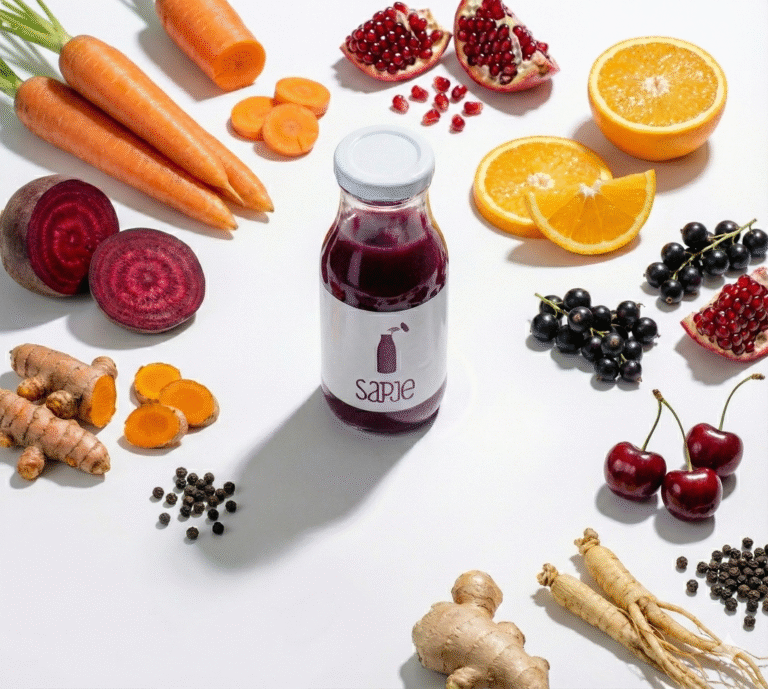 Wortel, Rode biet, Sinaasappel, Granaatappel, Kers, Zwarte bes, Kurkuma, Gember, Ginseng, Zwarte peper