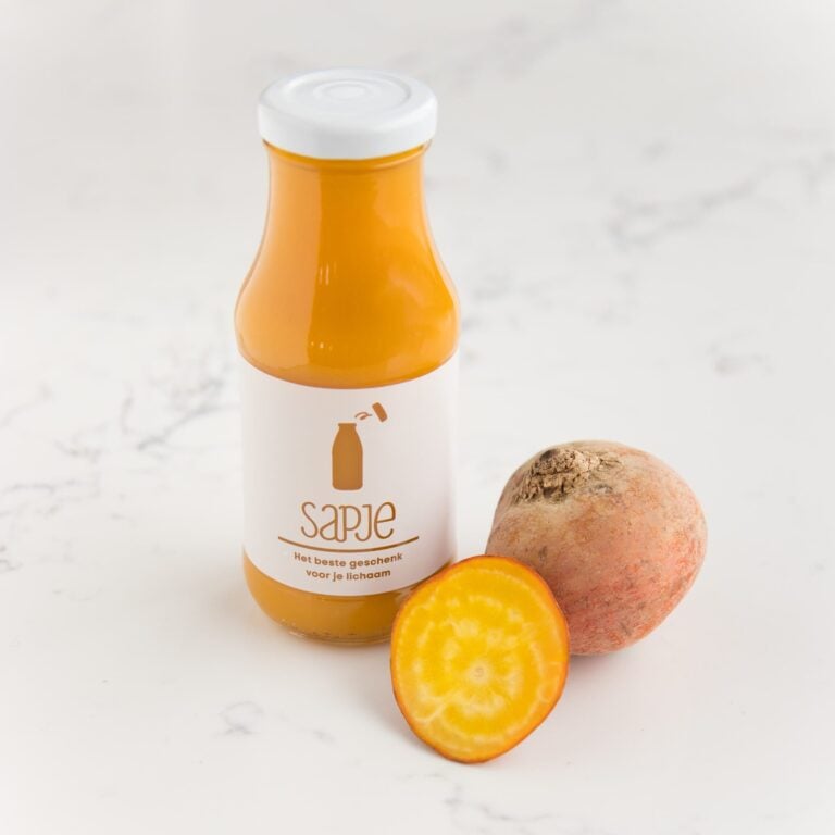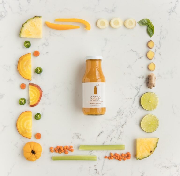 Ingrediënten Bleekselderij, Gember, Jalapēno, Wilde kweepeer, Ananas, Basilicum, Gele biet, Gele paprika, Kurkuma, Limoen, Wilde duindoornbes, Witte wortel