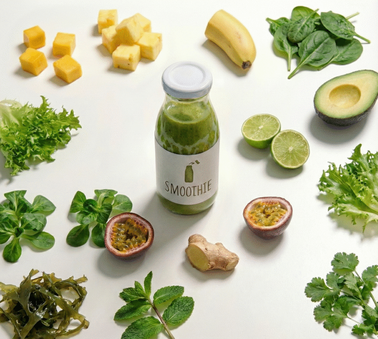 Water, Mango, Ananas, Banaan, Spinazie, Avocado, Andijvie, Limoen, Passievrucht, Veldsla, Gember, Munt, Zeesla, Koriander