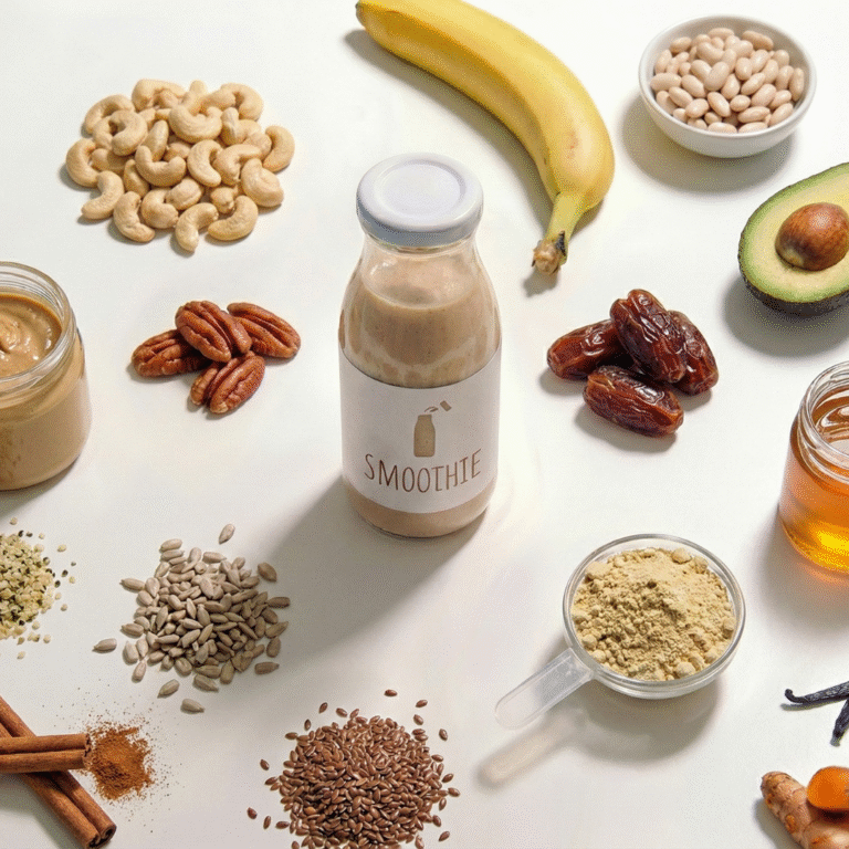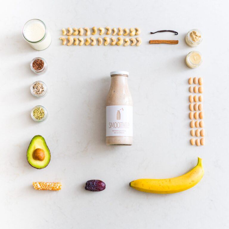 Huisgemaakte cashewmelk, Banaan, Witte bonen, Avocado, Dadel, Cashewpasta, Honing, Erwt eiwitpoeder, Sesampasta, Zonnebloempitten, Hennepzaad, Lijnzaad, Vanille, Kaneel