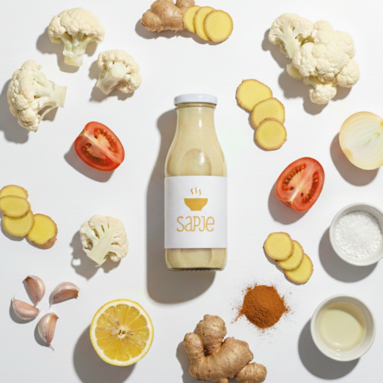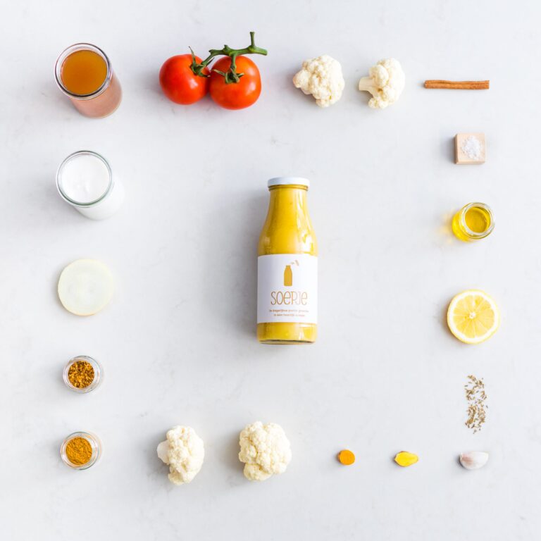 Ingrediënten Bloemkool, Groentebouillon, Kokosmelk, Tomaat, Ui, Gember, Extra vierge olijfolie, Keltisch zeezout, Citroensap, Knoflook, Garam masala, Kerriepoeder, Komijn, Kurkuma, Kaneel