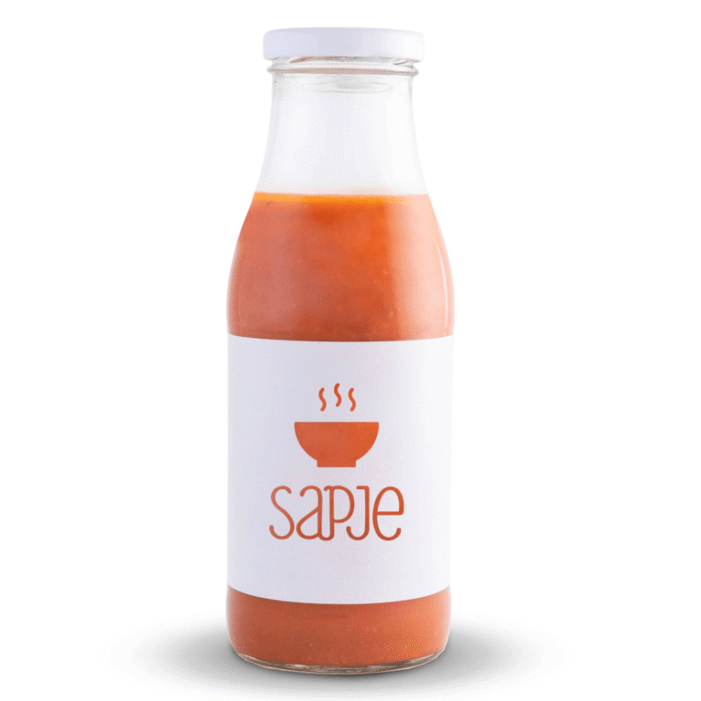 Groentebouillon, Rode paprika, Tomaat, Rode ui, Extra vierge olijfolie, Knoflook, Keltisch zeezout, Basilicum, Rode wijnazijn, Paprikapoeder, Gerookte paprikapoeder, Piment d’espelette, Venkelzaad